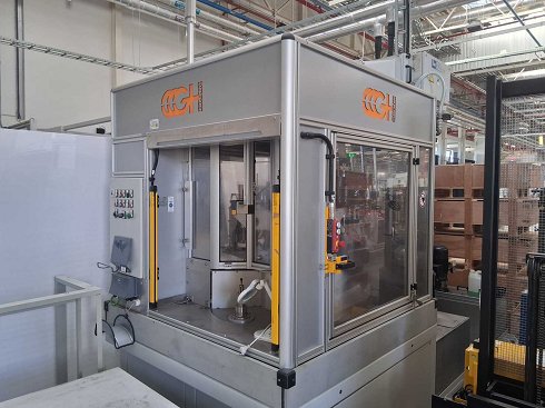 Contacto: Alexander Kosir/ +436641029345/ a.kosir@tbauctions.comI Máquina de endurecimiento por inducción para ejes o componentes ZF con dimensiones similares Alimentación: La máquina se acciona desde la parte frontal y las piezas se colocan en soportes en la mesa giratoria para el mecanizado. La mesa rotatoria de indexación alimenta la pieza de trabajo en la máquina para el mecanizado. Las piezas mecanizadas se retiran en la misma estación. La pantalla de luces situada directamente sobre el operador se utiliza para clasificar la pieza como una pieza aceptable o no. Endurecimiento 1: Una vez que la mesa de indexación rotatoria está posicionada, la mesa de indexación de bola recirculante baja el mezclador a su posición. Un contrapeso con peso superior descansa sobre la pieza, impidiendo que se levante. La pieza se controla mediante un acoplamiento magnético inferior de la tabla de indexación rotatoria. Un sensor comprueba la rotación correcta. Un inductor calienta la pieza hasta la |