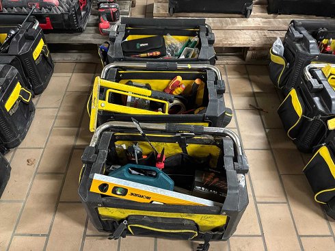 3 bolsas de herramientas Stanley llenas de varias herramientas. |