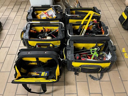 3 bolsas de herramientas Stanley llenas de varias herramientas. |