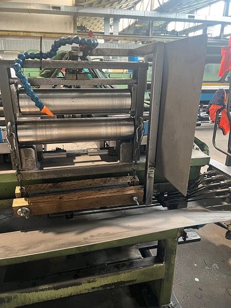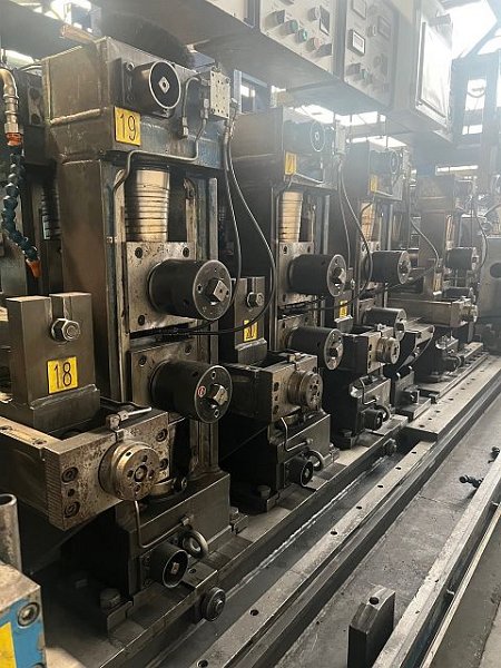 | Detalles | FEEDSTOCK STEEL STRIP Espesor max.: 4 mm Espesor mín. de fleje: 0.8 mm PRODUCT (PROFILE, TUBE) external diameter min.: 24.9 mm external diameter max.: 60 mm wall thickness min.: 0.8 mm wall thickness max.: 4 mm LINE CHARACTERISTICS Forming Process: rollforming welding process: HF inductive sawing process: travelling system consisting of: - large coil reel - Bandschweisseinrichtung - optional: horizontal band loop - side planer - forming unit - HF welding unit - units for outside scarfing, inside scarfing - each without impeders, tooling - cooling section - calibration unit with alternative calibration station for ovals, polygons - flying saw - chip blow unit - hexagon bundling- and binding unit optional roll-sets available for: forming section: 26,30, 32, 36, 38, 40, 44, 46, 52, 60 mm calibration section: 25, 26, 29.5, 29.89, 30, 32, 33, 33.4, 33.5, 33.7, 34, 35, 36, 37, 38, 39, 40, 42.4, 43, 44, 45, 46, 50, 51, 51.5, 57, 58, 60 mm without drawints |