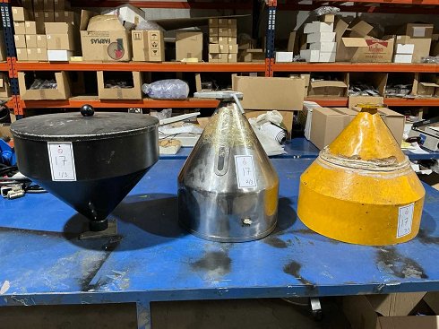 Tolvas de alimentación de materiales adecuadas para máquinas de moldeo por inyección: 1x (50 cm H x 52 cm Ø), 1x (55 cm H x 45 cm Ø), 1x (50 cm H x 45 cm Ø)