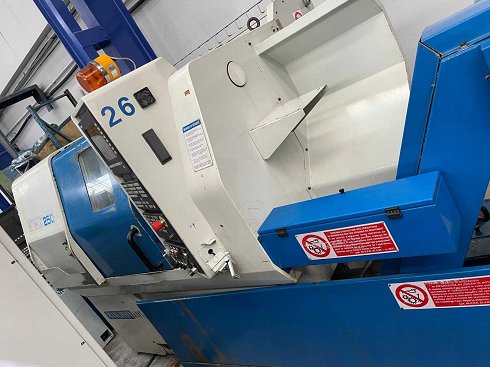 Fabricante: MANURHIN MENTI Modelo: K'MX 250 (MENTI mod. 250 ) Año: 2002 Tipo: torno CNC de 3 ejes con herramientas motorizadas Control CNC: Siemens 840D Número de serie: 81154 torno CNC de 3 ejes para operaciones de torneado y fresado con herramientas motorizadas. La máquina está equipada con una torreta VDI con herramientas giratorias y se entrega con un alimentador de barras hidráulico. Capacidades de mecanizado comunicadas por el vendedor: • Pasado de barras: Ø 60 mm • Diámetro del husillo: Ø 66 mm • Diámetro máximo de mecanizado: 300 mm (diámetro real) • Diámetro máximo permitido: 360 mm • Longitud máxima de giro: 600 mm • Distancia entre puntas: 870 mm Husillo: • Nariz ISO-A6 • Velocidad de rotación: 0 a 4.000 rpm • Potencia: 15 kW (S1) Ejes: • Carrera del eje X: 190 mm• Carrera del eje Z: 650 mm• Alimentaciones rápidas X/Z: 18 m/ min Equipamiento listado por el vendedor: • Torreta Baruffaldi VDI de 12 estaciones con 6 herramientas motorizadas • Cilindro SMW-AUTOBLOK