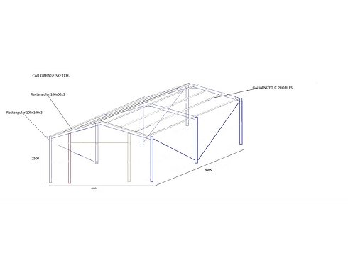 Dimensión total L 4000 mm Año de construcción 2026 Material Acero Dimensión total L 6000 mm Dimensiones totales Altura 2500 mm Superficie total de 24 m² Información adicional Información adicional Construcciones metálicas; La construcción consta de: 3 cerchas hechas de tubo rectangular de 100x50x3; 6 pilares hechos de tubo cuadrado de 100x100x3; 3 pilares de puerta de perfil C 100, cuñas de conexión para cerchas de perfil C 100 galvanizado; La construcción es desmontable, con tornillos; Estado: no utilizado; La construcción incluye un certificado de conformidad, un plano de construcción; aprovechando a gratis." No incluye chapa metálica |