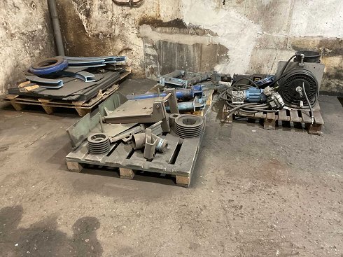 Varias piezas para máquinas, incluyendo Motores, soportes, poleas, etc., en 4 palets, incluidos los palets. |
