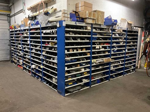 9 armarios con contenidos compuestos de pequeños materiales para máquinas, incluyendo abrazaderas de manguera, válvulas, herramientas especiales, fijaciones, acoplamientos, rodamientos, mangueras, giro, pasadores, ejes, incluidos 9 armarios 'Fabory'. |