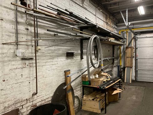 Varios materiales de barra en soportes de pared, incluyendo cosas debajo, como mesas, cilindros, tapas, etc. |