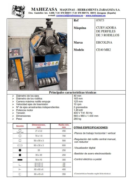 | Detalles | De 3 rodillos, diámetro ejes 40 mm, diámetro rodillos 165 mm, carrera máxima rodillo empuje 125 mm, con visualizador digital |
