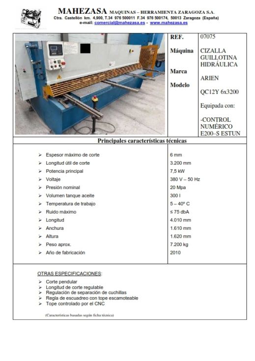| Detalles | Longitud de corte 3.200 mm Espesor de corte 6 mm equipada con CNC E200-S Estun, corte pendular |