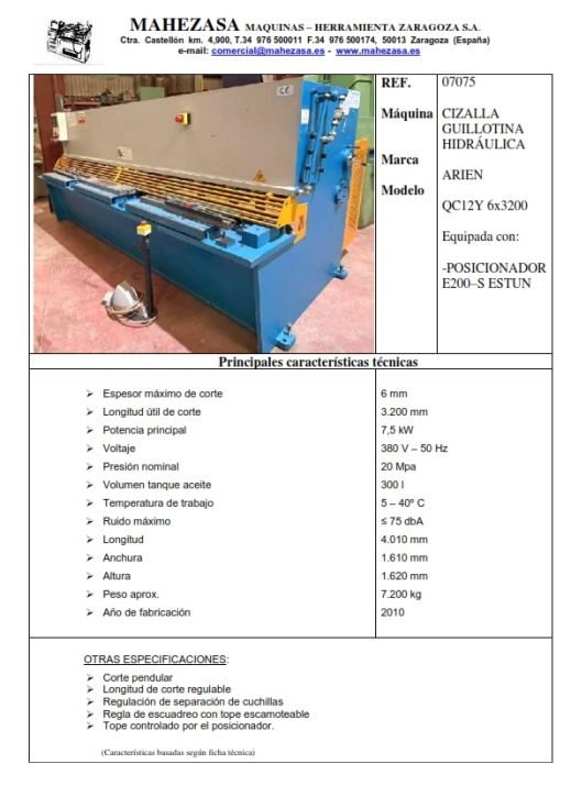 | Detalles | Longitud de corte 3.200 mm Espesor de corte 6 mm equipada con posicionador E200-S Estun, corte pendular |