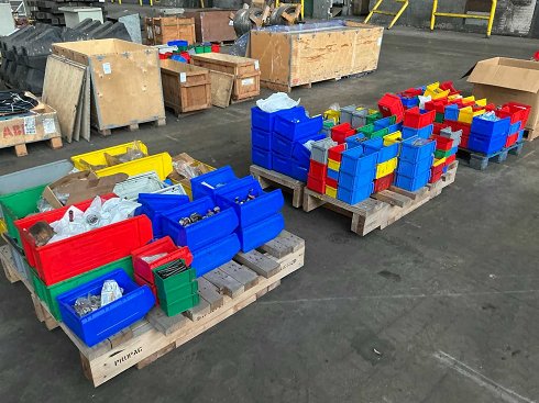 incluyendo cepillas de carbón, tornillos y tuercas, pasadores de protección, arandelas de bloqueo, bujóns Harting, .... en 3 palets |