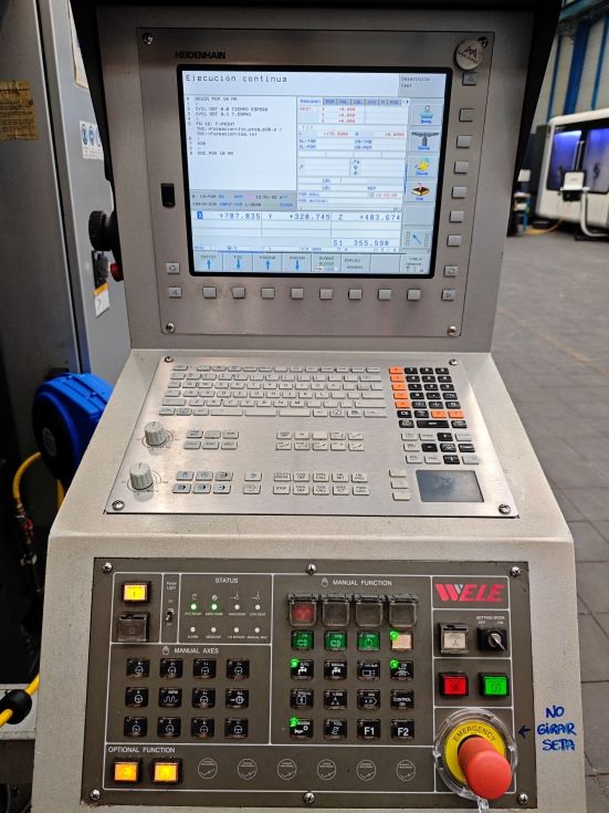 | Detalles | Centro de mecanizado WELE Modelo RB 212 CNC Heidenhain iTNC 530 (HSCI) Año 2016 Dimensiones de la mesa : 2000 x 1100 mm Recorridos en X : 2120 mm Recorridos en Y : 1200 mm Recorridos en Z : 800 mm Paso máximo carga : 3500 Kg Peso : 18000 Kg Tipo cono : DIN 2080 A-50 (ISO 50) Numero herramientas : 60 Velocidad husillo : 10000 rpm Medidor de htas. Laser Blum
