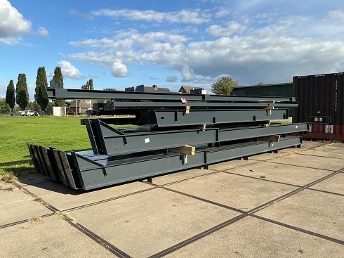 Pendiente del tejado 15 grados La construcción consiste en: 7 cerchas intermedias: 2 x columna I360 y los primeros 4,00 metros de la viga del techo I360 y el resto de la viga del techo I270 2 cerchas de extremo: 2 x columna de esquina H160, 2 x viga de techo H160, 2 x columna intermedia H160, 2 x columna intermedia U240 y 1 x viga de puerta U240 a 5,00 mtr. 32 tubos de acoplamiento 70 x 70 x 3 mm 28 Refuerzo de 20mm. Con tensor M20 Recubrimiento en polvo RAL7016 Tornillos 8.8 Con certificado de marca CE NEN 1090. El solar está cargado con una carretilla elevadora gratis