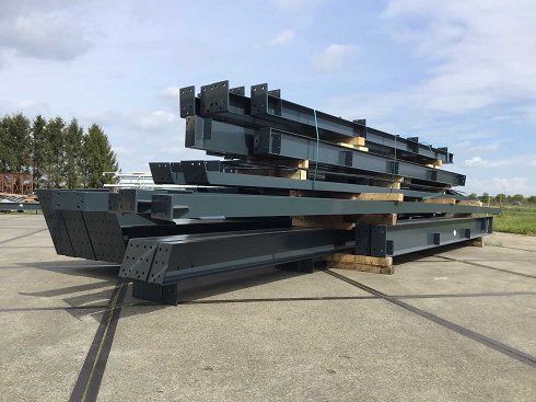 2 cerchas de extremo: 2 x columna de esquina H160, 2 x viga de techo H120, 2 x columna intermedia I200, 2 x columna intermedia U220 y 1 x viga de puerta U220 a 4,50 mtr.