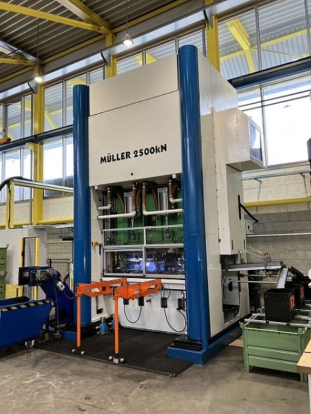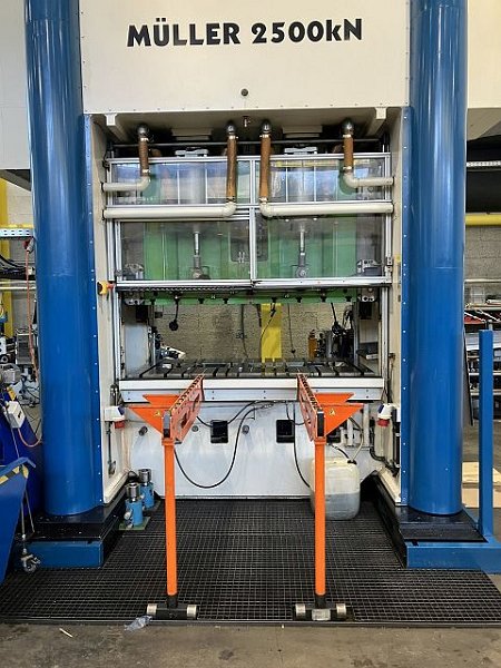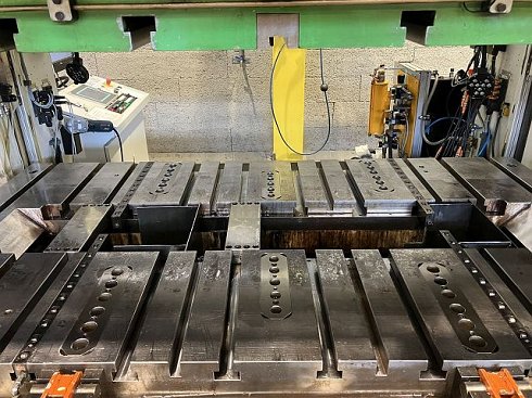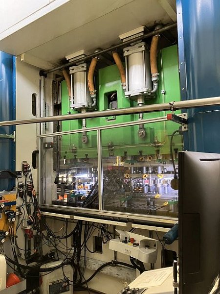 | Detalles | CONTROLS Control electrónico SIEMENS S7 300 TIPO DE PRENSA Sistema de accionamiento: Excéntrica / Cigüeñal Paso entre montantes lateral (paso banda): Sí Número de bielas / Cilindros: 2 Cojines inferiores: No sistema de cambio rápido de troqueles: Sí FUERZA Fuerza total: 250 to MESA INFERIOR Anchura de la superficie de sujeción: 2000 mm Profundidad de la superficie de sujeción: 1100 mm Altura de la mesa respecto del suelo: 1105 mm Agujero mesa (ancho): 1700 mm Agujero mesa (profundidad): 305 mm CARRO Anchura de la superficie de sujeción: 2080 mm Profundidad de la superficie de sujeción: 1000 mm N° golpes / minuto máx.: 120 /min CARRO (PRENSA MECÁNICA) Regulación del carro: 120 mm Regulación de la carrera: Sí Carrera mín.: 20 mm Carrera máx.: 180 mm DIMENSIONES DE TRABAJO Altura de cierre (carrera máx. y regulación arriba): 500 mm Paso entre montantes frontal: 2055 mm Ventanas laterales (ancho paso banda): 810 mm DEVANADORA Ancho de banda máx.: 300 mm Peso máx. de bobina: 2 to Diámetro exterior máx. de bobina: 2000 mm Diámetro interior máx. de bobina: 550 mm UNIDAD APLANADORA Ancho de banda máx.: 310 mm Número de rollos aplanadores: 7 Diámetro rodillos aplanadores: 80 mm ALIMENTADOR Tipo de alimentador: Rodillos Ancho de banda máx.: 200 mm Espesor max.: 4 mm Velocidad máx.: 120 m/min DATOS DE CONEXIÓN ELÉCTRICOS Consumo de energía eléctrica (total): 95 kW Tensión de conexión: 400 V Frecuencia de la red: 50 Hz DIMENSIONES / PESO espacio requerido -izquierdo/derecha-: 4800 mm espacio requerido -delante/atrás-: 2750 mm Altura total: 5400 mm Peso total aprox.: 57000 kg ACCESORIOS/ANEXOS (PRENSAS) Devanadora: Sí Enderezador: Sí Certificado CE: Sí Machine hours: 20,391 h (operating hours) Adjustment strokes: 20, 39, 69, 99, 125, 148, 165, 175, 180 mm Equipment: - External connecting rods for high tilt stability - Hydraulic overload protection - Press force monitoring - Temperature sensors at the bearing points - ABS AHM 2.0T decoiler (1999) - PBK RSD 8/6/300 straightener (2010) - Loop belt control - LW-060-02 roller feed (2008) - Advanced central lubrication system - Press force monitoring - Temperature sensors at the bearing points - Hydraulic tool clamps - Spring-loaded machine feet Defect: Defective cylinder leaks (slow pressure build-up) - Optional: Bilz air springs for an additional €7,000 Not included: - Belt lubrication - Cutting shock absorption (external device) |