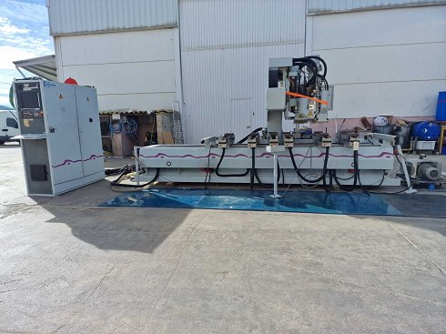 • Centro de mecanizado CNC • Número de serie 0-250-06-1632 • Potencia total instalada aprox. 18 KW • Área útil de trabajo aprox., 2750 x 1.000 mm • Eje X de trayectoria de viaje: 3455 mm, eje Y: 1480 mm, eje Z: 260 mm • Velocidad máxima de recorrido en las direcciones x-y-z: 80-60-20 m/min • Cargador de herramientas con 8 posiciones • ¿Electrohusillo: potencia 7,50 KW-max, 24000 rpm, cambio automático de herramienta, para portaherramientas HSK F63, refrigerado por líquido • Grupo de fresado / sierra con motor de 1,50 KW • Unidad de sierra a ranura • Husillos verticales de perforación en dirección al eje X: 11 • Husillos de perforación verticales en dirección al eje Y: 8 • Husillos de perforación horizontales en dirección al eje X: 3 + 3 • Control numérico NUM 1040 • Software Windows 95 / HOMAG WOODWOP • 6 consolas con 2 ventosas de vacío cada una • 6 módulos de elevación para piezas pesadas • Bomba de vacío BECKER KVT 3.100 con capacidad de 100 m³/h • Condiciones de