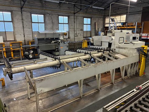 Valor de la característica Diámetro de lapala Ø425 mm (HSS) Corte (redondo) Ø10–140 mm Corte (cuadrado) 10×10 ¿125×125 mm Corte (B×H plano) 140×125 mm Profundidad máxima (HSS)~300 mm Velocidad de avance16–600 mm/min (programable) Velocidad de entrada5000 mm/min Motor de palasHSS 10,0 kW / HM 29,0 kW Velocidad de corteHSS 6–70 m/min · HM 80–150 m/min Máximo aprietandoPrinc. 2200 daN · Avance 1400 daN Hidráulica3 kW Bomba de refrigeración.25 l/min · 0,1 kW Altura de rodamiento: 950 mm Fuente de alimentación de precisión±0,05 mm/300 mm Longitud de la cinta transportadora: 5400 mm.