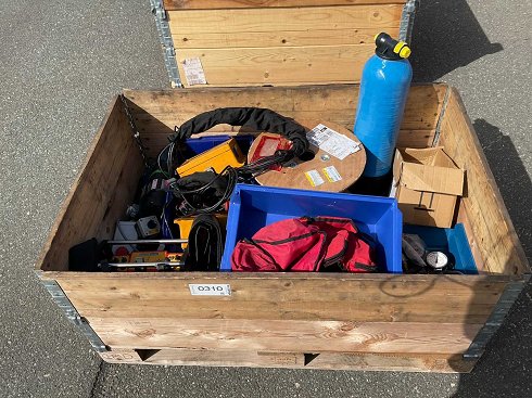 Contenido: tambores de cable, unidades de control eléctrico (caja amarilla), un recipiente o filtro de presión azul, así como varios cables y bolsas |