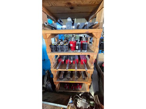 Contenido: Cilindros hidráulicos variados de varios tamaños y tipos, incluyendo motores hidráulicos compactos y bloques de válvulas, almacenados en una cremallera de madera de 5 estanterías