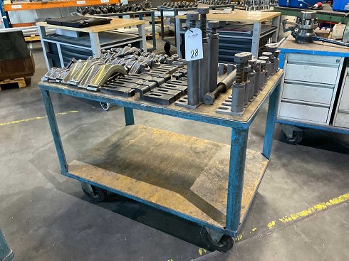 Lote de material de sujeción para banco de máquinas, que consiste en: bloques de sujeción, mordazas de sujeción, abrazaderas en T, juegos y tornillos de varios tamaños. Incluye: (1x) carrito de estantería. |