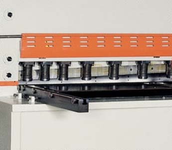 - Pisadores hidráulicos de chapa:Descienden hidráulicamente lo que permite un apriete regulable según el espesor y dureza de la chapa a cortar. En la parte que contacta con el material dispone de una arandela de teflón para evitar rayas y marcas en chapas pulidas. La recuperación es también regulable. Por razones de seguridad la máquina se protege en la parte frontal con una reja metálica. Puede abrirse en una tramo de 1 metros para introducir chapas trazadas y facilitar el corte que debe hacerse tras cerrar la reja y reiniciar la marcha