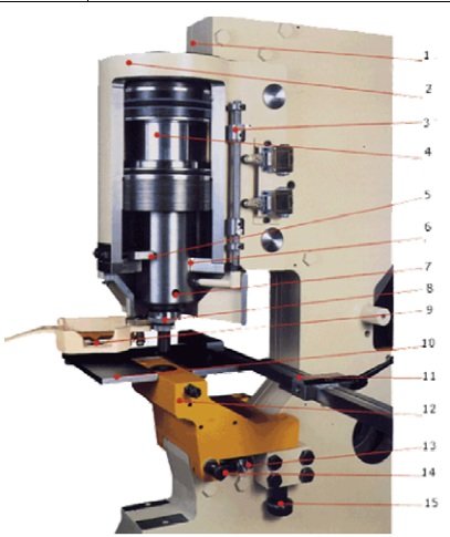 | 1. Apoyo del cilindro2. Cilindro de doble efecto HYDRACROP 110 “S” seccionado.3. Topes regulación curso.4. Amplio curso para trabajos de plegado, embutido, formado, etc5. Generoso guiado antigiro regulable6. Guiado adicional para absorción de esfuerzos descentrados y protección juntas hidráulicas.7. Vástago preparado para fijación de útiles especiales.8. Cambio rápido de punzón.9. Tope regulable en altura10. Mesa con reglas milimetradas, incluido en el “kit”11. Tope posicionamiento hasta 500 mm.12. Porta-matriz cuello cisne para punzonado de chapas y perfiles.13. Tensor longitudinal con sistema de ataque frontal