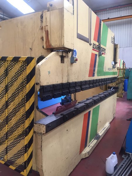 Características técnicas: Potencia de plegado: 125t Longitud de plegado: 4.050mm Paso entre montantes: 3.100 Cuello de cisne: 400mm Recorrido: 150mm Abertura (mesa-trancha): 350 Ancho de mesa: 150mm Longitud total de máquina: 4.250mm Anchura total de máquina: 1.600mm Altura total de máquina: 2.445mm Detalles del equipo hidráulico: