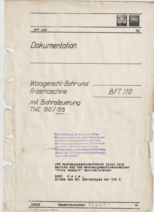 | Name | UNION - BFT 110 / 7 Horizontal borer Ø 110 X 1985 Y 1620 Z 1960 W 710 mm |