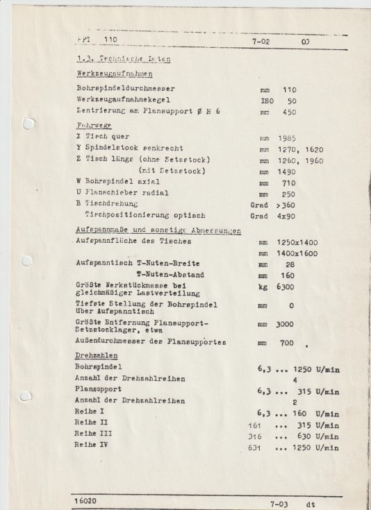 X – Travel 1.985 mm Y – Travel 1.620 mm Z – Travel 1.960 mm W – Travel 710 mm Table Length 1.600 mm Table Width 1.400 mm Table load 6.300 kg Speeds / ranges 1250 Rpm Power 25 kW Spindle Tape rIso 50 ISO/Bt/Mk Number of controlled axis 4 Control Heidenhain TNC 155 |