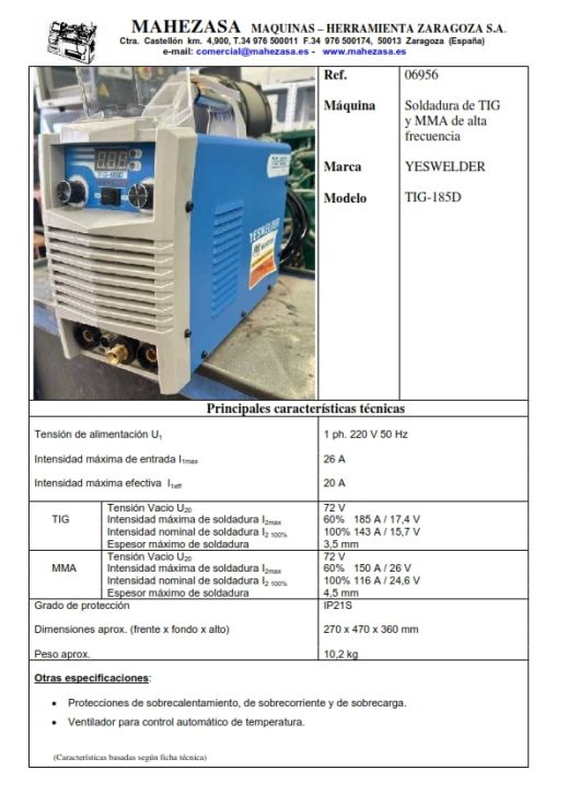 | Details | Soldadura de TIG y MMA de alta frecuencia, Intensidad máxima de soldadura: TIG al 60% 185 A / 17,4 V, MMA al 60% 150 A / 26 V |