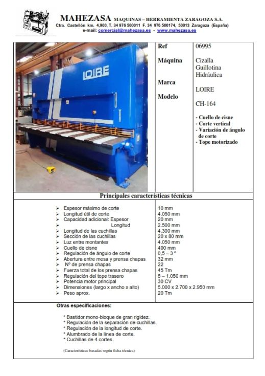 Longitud útil 4.050 mm x 10 mm de espesor, capacidad adicional longitud 2.500 mm x 20 mm espesor, Cuello de cisne, corte vertical, variación de ángulo de corte y tope motorizado