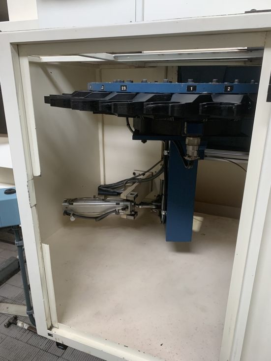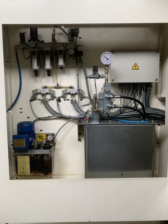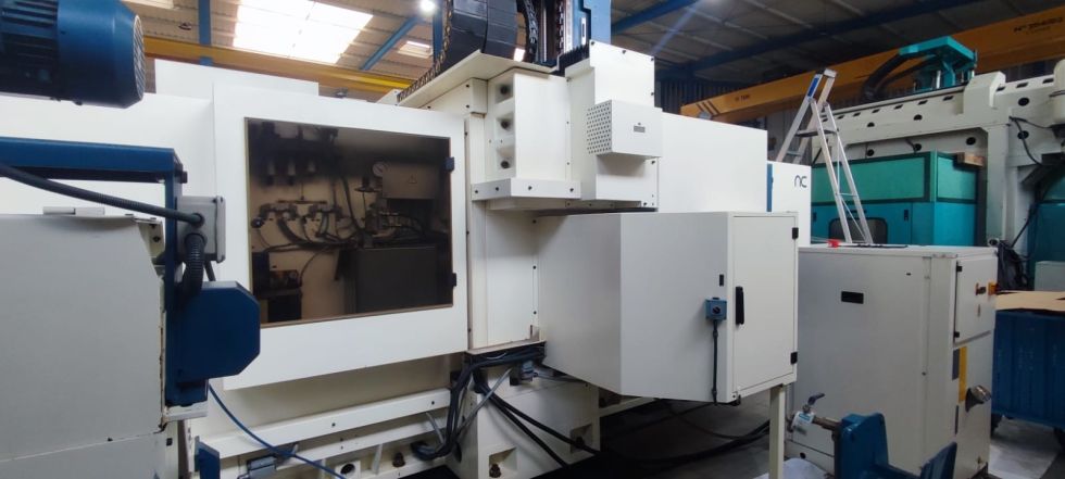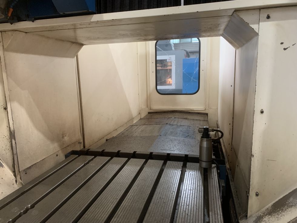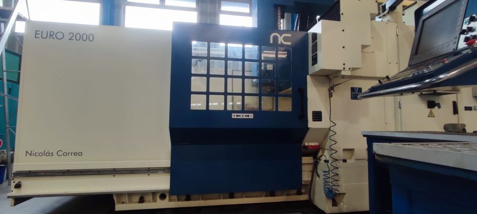 Fresadora de puente NICOLAS CORREA Año 2003 Modelo EURO 2000 CNC Heindenhain 530 Dimensiones de la mesa 2000 x 1000 mm Ranuras en T 8 x 22 mm Peso admisible sobre la mesa 5000 Kg. Recorridos en eje X 2000 mm Recorridos en eje Y 1250 mm Recorridos en eje Z 800 mm Amarre herramienta Hidráulico Cono HSK 63 Velocidad 18000 rpm Avances de trabajo 10000 mm/min Avance rápido 20000 mm/min ATC Random 24 herramientas Refrigeración interior