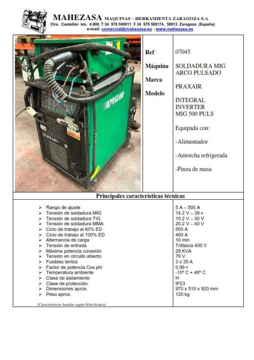 | Details | Equipada con alimentador, antorcha refrigerada y pinza de measa, Rango ajuste 5 - 500 A Ciclo de trabajo al 60% 500 A al 100% 400 A |