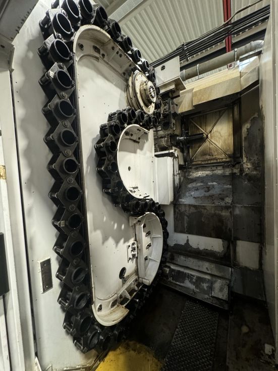 | Details | sp; 2 Feed rate X-Axis: 60000mm/min. Feed rate Y-Axis: 60000mm/min. Feed rate Z-Axis: 60000mm/min. Spindle Taper: 50ISO/Bt/Mk Power on spindle: 37kW Speeds / ranges: 6000Rpm ATC / revolver: 200 Coolant through spindle / Bar:20 Number of controlled axis: 4 Chip conveyor: Yes Coolantsystem: Yes Length: 6800mm Width: 3400mm Height: 3200mm Weight: 24000kg |