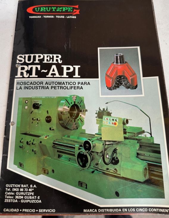 | Details | Torno Gurutzpe Super RT-API con Roscador Automático Fabricante: Gurutzpe Modelo: Super RT-API Tipo de máquina: Torno paralelo roscador automático, ideal para empresas petroleras e hidráulicas Capacidades principales: -