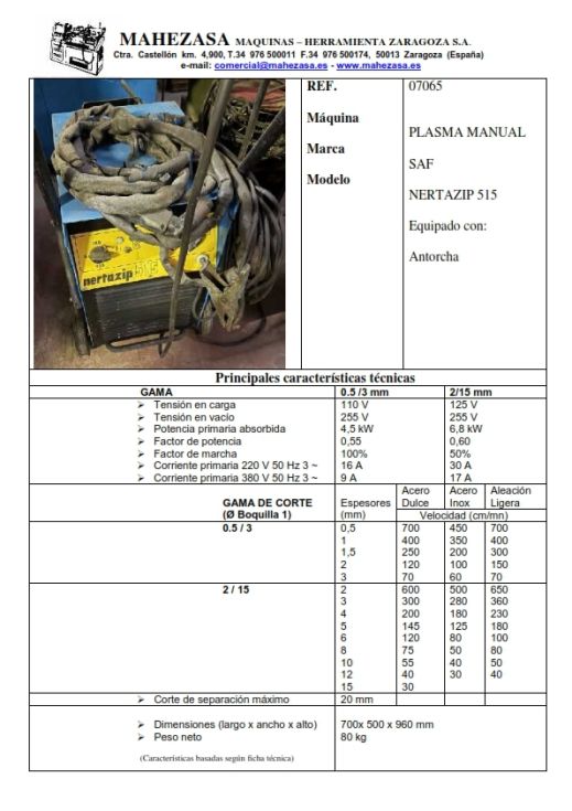 Equipado con antorcha, Gamas de corte: 0,5 / 3: Espesores de 0,5 a 3 mm - 2 /15: Espesores de 2 a 15 mm, Corte de separación máximo 20 mm