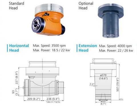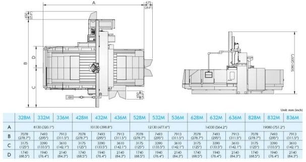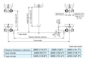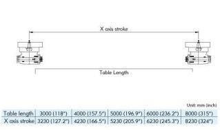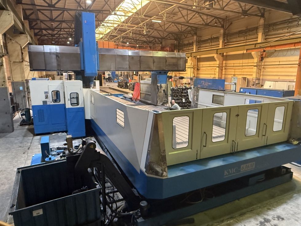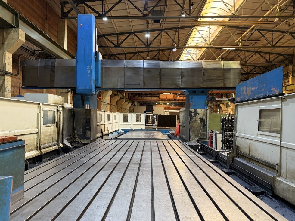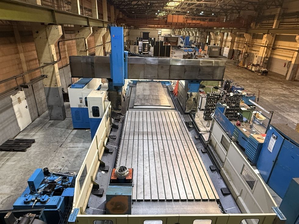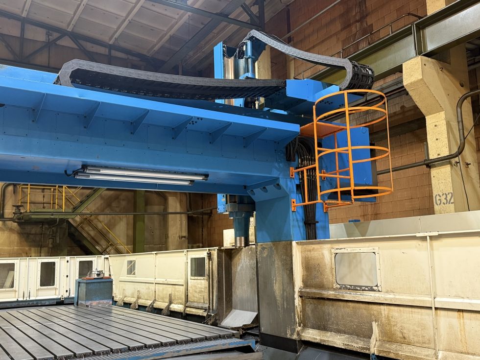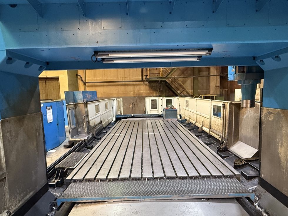 Double guideway four box way construction Head changer for Multi-Face machining off larger compontents ATC tool changer for Horizontal and vertical milling head swivabel Distance table spindle nose 345 - 1445 mm Distance table spindle center 132 - 1232 mm Indexing Horizontal head 5 Degrees x 72 positions HeidenHain iTNC530 with HR410 handwheel Spindle torq 1018 Nm ISO50 X - Travel: 6230mm Y - Travel: 4250mm Z - Travel: 1100mm Distance between column: 3600mm Table Length: 6000mm Table Width: 3000mm Table load: 15000 Feed rate X-Axis: 7000mm/min. Feed rate Y-Axis: 8000mm/min. Feed rate Z-Axis: 10000mm/min. Spindle Taper: 50ISO/Bt/Mk Power on spindle: 26kW Speeds / ranges: 4000Rpm ATC / revolver: 30 Number of controlled axis:3+2 Chip conveyor: Yes Coolantsystem: Yes Length: 14330mm Width: 7913mm Height: 5080mm Weight: 66000kg