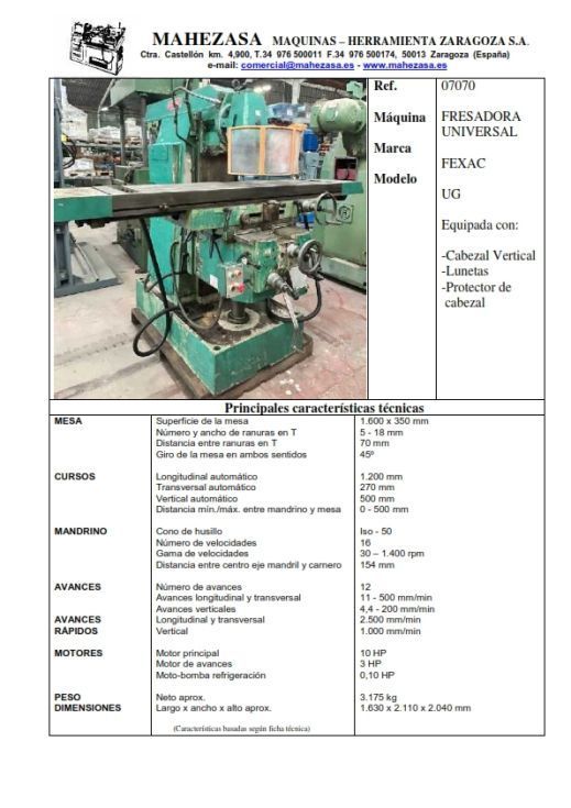 Equipada con Cabezal vertical, Lunetas y Protección de cabezal, Mesa 1.600 x 350 mm Cursos automáticos: Longitudinal 1.200 mm Transversal 270 mm Vertical 500 mm
