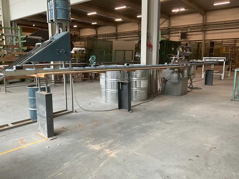 Características: (1x) Tope de longitud y sistema de medición con control de un eje para posicionamiento de longitud de corte, Tipo: AMS 200, Año de construcción: 1994, Número de serie: 200203140, Tamaño: L3250xB500xH1500mm, Ancho de trabajo: 250mm, Altura de trabajo: 910mm. (1x) Cinta transportadora de rodillos de descarga: 4500x300mm, Ancho de trabajo: 250mm, Altura de trabajo: 910mm. |