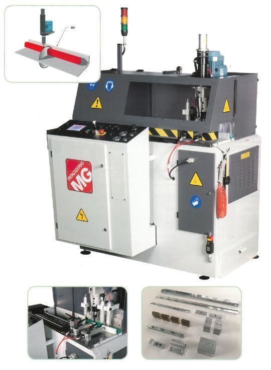 | Detalls | Vendo nueva a estrenar, Tronzadora mono cabezal automática con alimentador, CNC y unidad de mecanizado para taladrado, roscado y fresado, para corte recto a (90º) y mecanizado de perfiles de aluminio y PVC, marca “MG” modelo GAA-350-90º-CNC-TR12, con motor de 2,5 CV Diámetro de la sierra de widia incluida de 350 mm, velocidad de la sierra 3000 r.p.m., Tronzadora de ciclo automático, alimentador automático de 700 mm con husillo de bolas motorizado. Programador OMRON con 10 programas de 30 líneas, 20 referencias por programa, Velocidad de alimentación y corte regulables. Longitud con múltiples avances, Corte recto a 90º, Refrigeración automática aire-aceite. Funcionamiento semi automático o totalmente automático. Con seis pisadores neumáticos (3 Horizontales + 3 Verticales) Sistema de lubricación neumática mediante pulverizador. Altura máxima de corte 100 mm, Cortes redondos a 90º de 100 mm, Corte cuadrados a 90º de 100x100 mm, Corte rectangular a 90º de 170x60 mm |
