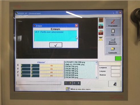 | Detalles | Technical characteristics The composition of this CNC is the following :- 3-axis horizontal ripper unit. Motor power: 3.3 kW- 3-axis vertical routing unit. Motor power: 3.3 kW- 3-axis drilling unitMaximum machining dimension :- Length: 4.000 mm- Width: 200 mm- Height: 150 mmSuction outlet : 1 out of 200 mmAir pressure: 6,5 barComputer : Windows 98Power and Motors :- Electrical power : 8Kw - Voltage : Three-phase 400V (3 phases + earth, 6mm2)- Intensity : 15AIncluded in the sales price:- Machine user manual, in English- Machine programming manual, in English- Manual for setting machine parameters according to machining requirements- Electrical diagrams- Description of error codes and possible solutions, in French Power and Motors Pluging: Three-phased Overall dimensions Lenght: 4600 mmWidth: 2100 mmHeight: 2000 mmWeight: 1500 Kg |