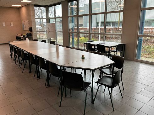 Conjunto de cantimplora que consta de: (9x) mesas rectas, (2x) mesas trapezoidales y (24x) sillas apilables para cantimplora. |