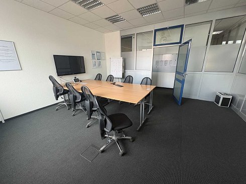 Compuesto por: 4 tablas, cada una de aproximadamente 1600x800x730 mm 8 sillas giratorias de oficina 1 flipchart, dimensiones aprox. 700x400x1700 mm Sin contenido ni requisitos