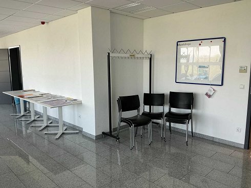 Contenido: 4 mesas de 95 x 95 x 73 cm (L/P/H), 9 sillas de oficina negras, 1 pizarra y 1 perchero |