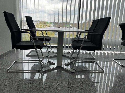 Contenido: 2 mesas de 95 x 95 x 73 cm (L/A/H), 2 x butacas de oficina negras en voladizo