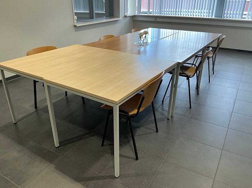 Consiste en 6 mesas de 120x80cm, aproximadamente 26 sillas (asiento/respaldo de madera sobre estructura metálica)
