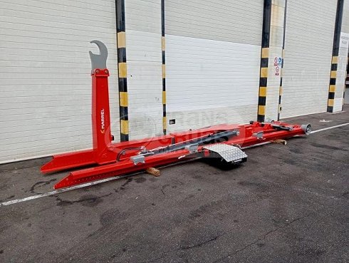 Equipo de gancho portacontenedor de 26 tn. de la marca Marrel/FASSI, para camión de tres ejes, con brazo telescópico y nueva versión de perfil bajo. este multibasculante incluye mandos neumáticos en cabina y rodillo estabilizador vertical, así como bloqueo exterior de carrocerías y gancho embulonado.