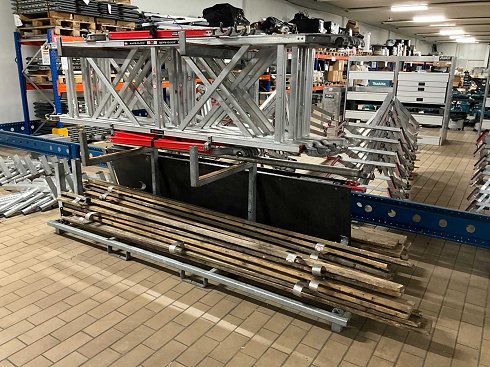 Partes del andamio que consisten en: 18 punteras de madera variadas, principalmente de 3 metros, 8 barandillas avanzadas Altrex SQ2 Safe-Quick de 245 cm y 1 plataforma Altrex RS Tower 5 de 245 cm