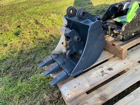 Cubo excavador con dientes reemplazables de 3 carburos y sistema de acoplamiento rápido para excavadora compacta. Completo y nunca usado (retirado de la máquina nueva para acoplar otro contenedor). CW0
