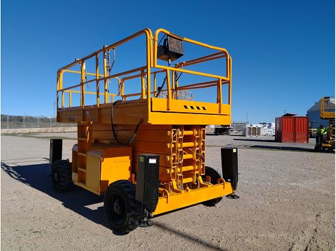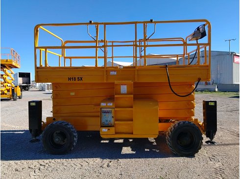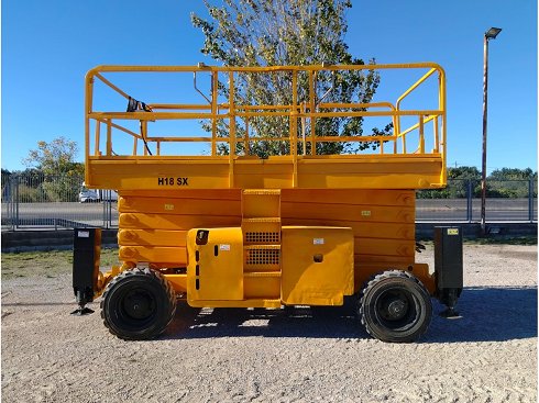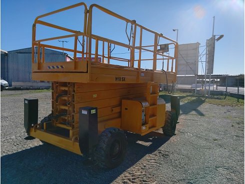 Plataforma tijera diésel HAULOTTE H18SX. Altura de elevación 18 metros y capacidad de carga de 500 Kg. Año de fabricación 2008.