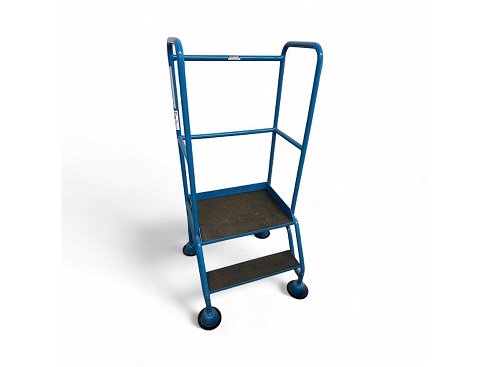 Producto: Escalera de seguridad con 2 escalones y barandilla circunferencial Material: Acero tubular, recubierto en polvo (azul) Características: Orugas antideslizantes Cuatro pies grandes para la estabilidad Barra de seguridad / barandilla alta para trabajar con seguridad Aplicación: taller, almacén, industria, para trabajo en posición elevada